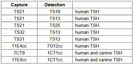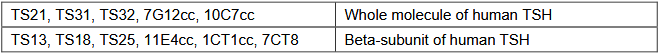 TS13, TS18, TS21, TS25, TS31, TS32, 7G12cc, 11E4cc, 10C7cc, 1CT1cc, 7CT8 do not cross-react with human LH, FSH, CG.11E4cc, 1CT1cc, 7CT8 also recognize beta-subunit of canine TSH.