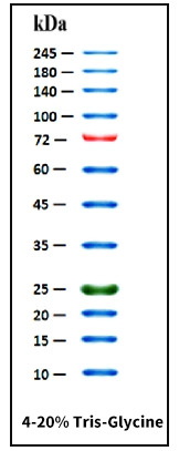 This product consists of 12 highly purified and prestained proteins ranging in molecular weight from 10 kDa to 245 kDa, among them, 72 kDa is orange band, 25 kDa is green band, 10/15/20/35/ 45/60/100/140/180/245 kDa are blue bands, the protein concentration of each band was about 0.1-0.4 mg/mL. Using this product, the state of protein