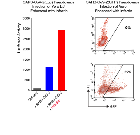 SARS-CoV-2 S protein pseudotyped lentiviral particle transduction of Vero E6 cells (Left):