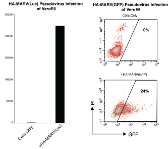Rapid MARV alpha-pseudovirus GFP transduction of VeroE6 cells (Right): VeroE6 cells were transduced with HA-MARV(GFP) alpha-pseudovirus (with a GFP reporter).  Reporter expression was quantified at 24 hours post-transduction (GFP flow cytometry).