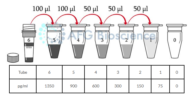 2. Standard Dilute the standard pipette 50 ul standard diluent in each tube. Pipette 100 ul standard in the fifth tube. And take out 100 ul from the fifth five tube into the fourth. Pipette 50 ul from the fourth tube to the third tube and produce dilution series as below. The undiluted Standard serves as the high standard. Sample Diluent serves as the zero standard blank well.