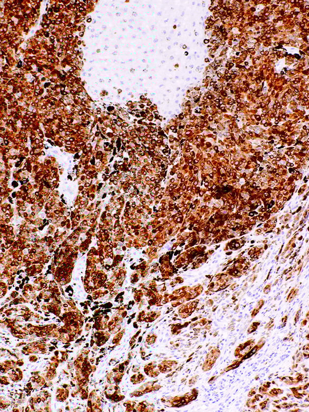 MART-1, also known as Melan A or Melanoma Antigen Recognized by T-Cells 1, is a protein antigen found specifically on melanocytes of normal skin, retina, and nevi, and not in other normal tissues. Anti-MART-1 is therefore useful as a marker for melanocytic tumours, and as an aid in establishing the diagnosis of metastatic melanomas.