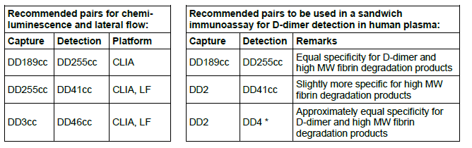 D-dimer and high molecular weight fibrin degradation products, no cross-reactivity with fibrinogen for DD1, DD189cc, DD2, DD22, DD255cc, DD3cc, DD41cc, DD44cc, DD46cc.
