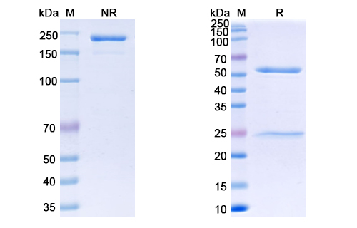 Anti-SARS-CoV-2 RBD Neutralizing Antibody (S2K146), on SDS-PAGE under reducing and non-reducing condition. The gel was stained overnight with Coomassie Blue. The purity of the protein is greater than 95%.