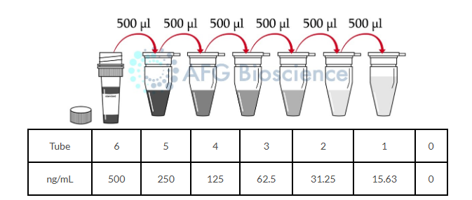 Prepare 7 tubes with 0.5 ml of Standard Diluent Buffer in each and create a series of dilutions using the Diluted Standard. Remember to thoroughly mix each tube before transferring the solution to the next tube by pipetting the solution up and down several times. Set up 7 points of Diluted Standard, decreasing the concentration each time, and use a Blank with no standard for comparison. It's important to use a new Standard Solution for each experiment to ensure accurate results. When diluting the Standard from high concentration to low concentration, replace the pipette tip for each dilution. Additionally, make sure not to transfer solution into the Blank tube from the previous one.
