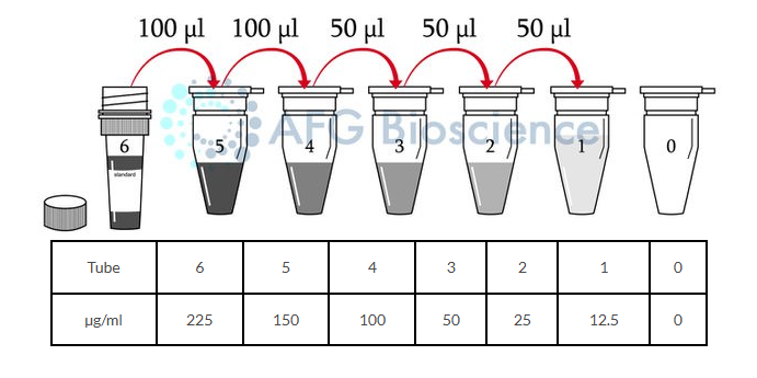 2. Standard Dilute the standard pipette 50 ul standard diluent in each tube. Pipette 100 ul standard in the fifth tube. And take out 100 ul from the fifth five tube into the fourth. Pipette 50 ul from the fourth tube to the third tube and produce dilution series as below. The undiluted Standard serves as the high standard. Sample Diluent serves as the zero standard blank well.