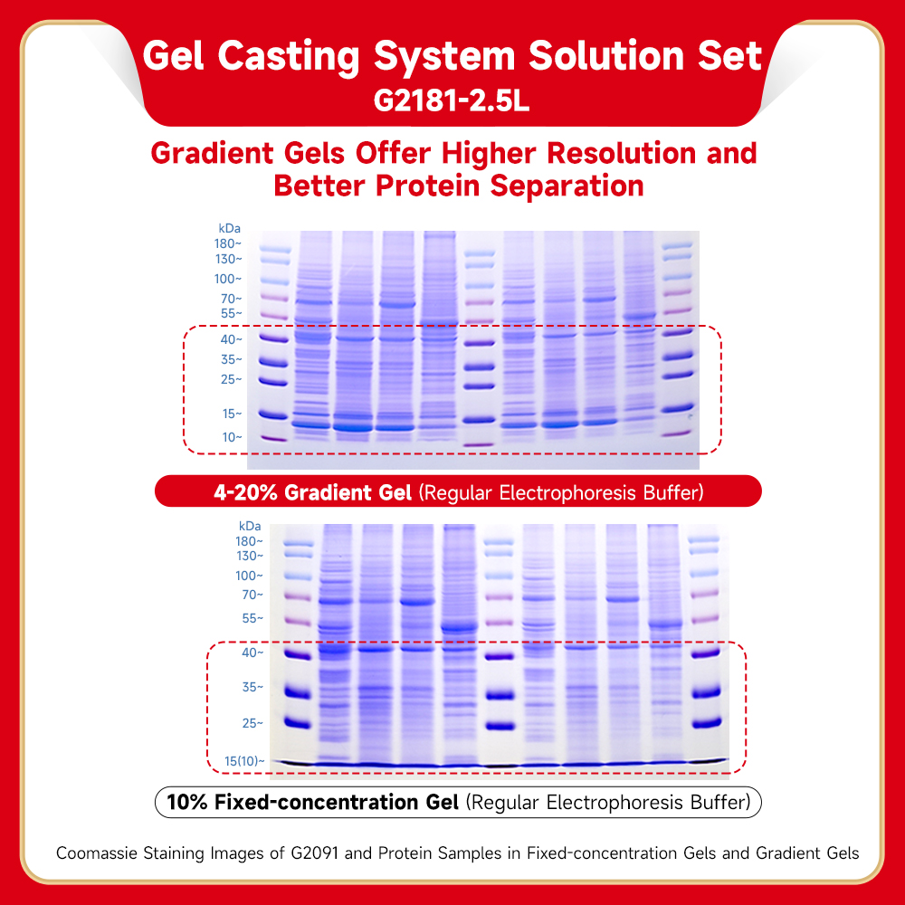 Excellent separation effect:This reagent is used with a special algorithm program of the gel making instrument. Not only equal gel, but also linear gradient gel can be prepared. Compared with equivalent gel, gradient gel electrophoresis has smoother, clearer, more delicate and sharper protein bands, with a wider separation range and higher resolution.