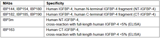 Detection of human IGFBP-4, NT-IGFBP-4, and CT-IGFBP-4. MAbs are working in direct ELISA