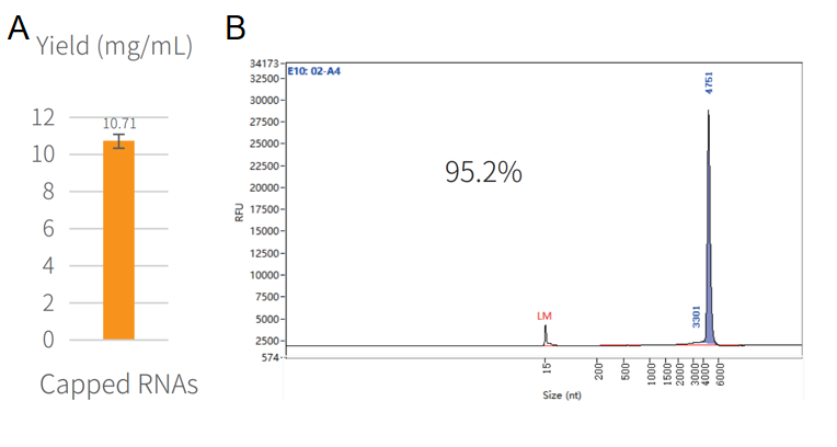 The reaction was incubated in a PCR instrument at 37℃ for 2h and then purified by magnetic beads (Cat#12602). The yield result was assayed by NanoDrop spectrophotometer as shown in Figure 3A. The integrity result was analyzed by capillary electrophoresis as shown in Figure 3B.