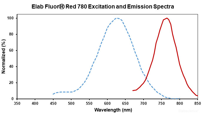 | Elab Fluor® Red 780 is designed to be excited by the Red (627-640 nm) laser and detected using an optical filter centered near 770 nm (e.g., a 780/60 nm bandpass filter). | |