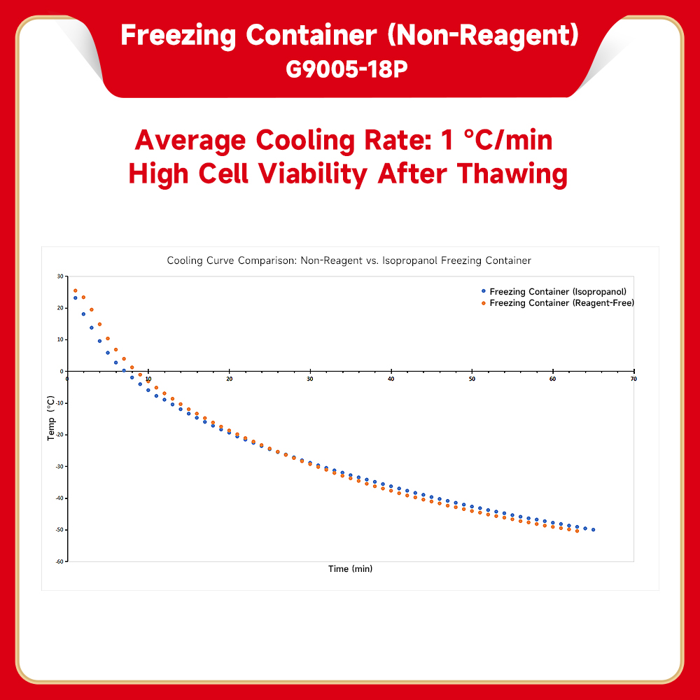 내부 특수 냉각 소재가 평균 -1°C/min의 냉각 속도를 보장 → 대부분의 세포 동결에 최적화.