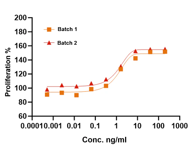 Figure 5.GMP-grade Human IL-3 demonstrates consistent cell activity in Human TF1 cells across different batches, indicating high batch-to-batch consistency.