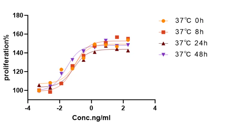 Figure 3. Results of the cell proliferation experiment on stimulated Human TF-1 cells show that GMP-grade Human IL-3 protein remains stable at 37°C after reconstitution for 48 hours.