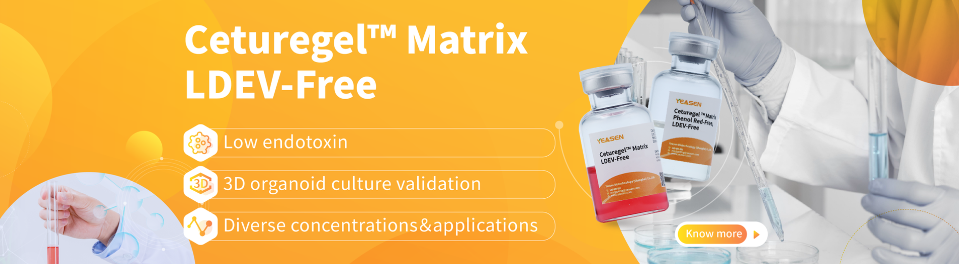 Ceturegel™ Matrix LDEV-Free Matrix is a soluble basement membrane preparation extracted from EHS mouse tumors rich in extracellular matrix proteins. Its main components are laminin, type IV collagen, heparan sulfate proteoglycan (HSPG), and nestin as well as growth factors such as TGF-beta, EGF, IGF, FGF, tissue plasminogen activator, and other growth factors contained in EHS tumors. At room temperature, it aggregates to form a biologically active three-dimensional matrix, which simulates the structure, composition, physical properties, and functions of the cell basement membrane in vivo, which is beneficial to the culture and differentiation of cells in vitro. It can be used for studies of cell morphology, biochemical function, migration, invasion, and gene expression.