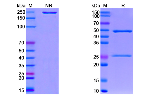Anti-CoV-RBD (E4) antibody, on SDS-PAGE under reducing and non-reducing condition. The gel was stained overnight with Coomassie Blue. The purity of the protein is greater than 95%.