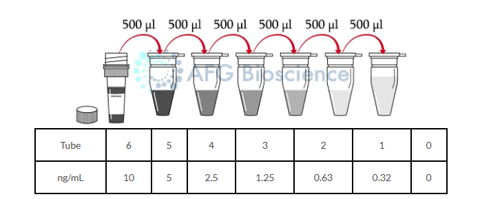 Prepare 7 tubes with 0.5 ml of Standard Diluent Buffer in each and create a series of dilutions using the Diluted Standard. Remember to thoroughly mix each tube before transferring the solution to the next tube by pipetting the solution up and down several times. Set up 7 points of Diluted Standard, decreasing the concentration each time, and use a Blank with no standard for comparison. It's important to use a new Standard Solution for each experiment to ensure accurate results. When diluting the Standard from high concentration to low concentration, replace the pipette tip for each dilution. Additionally, make sure not to transfer solution into the Blank tube from the previous one.