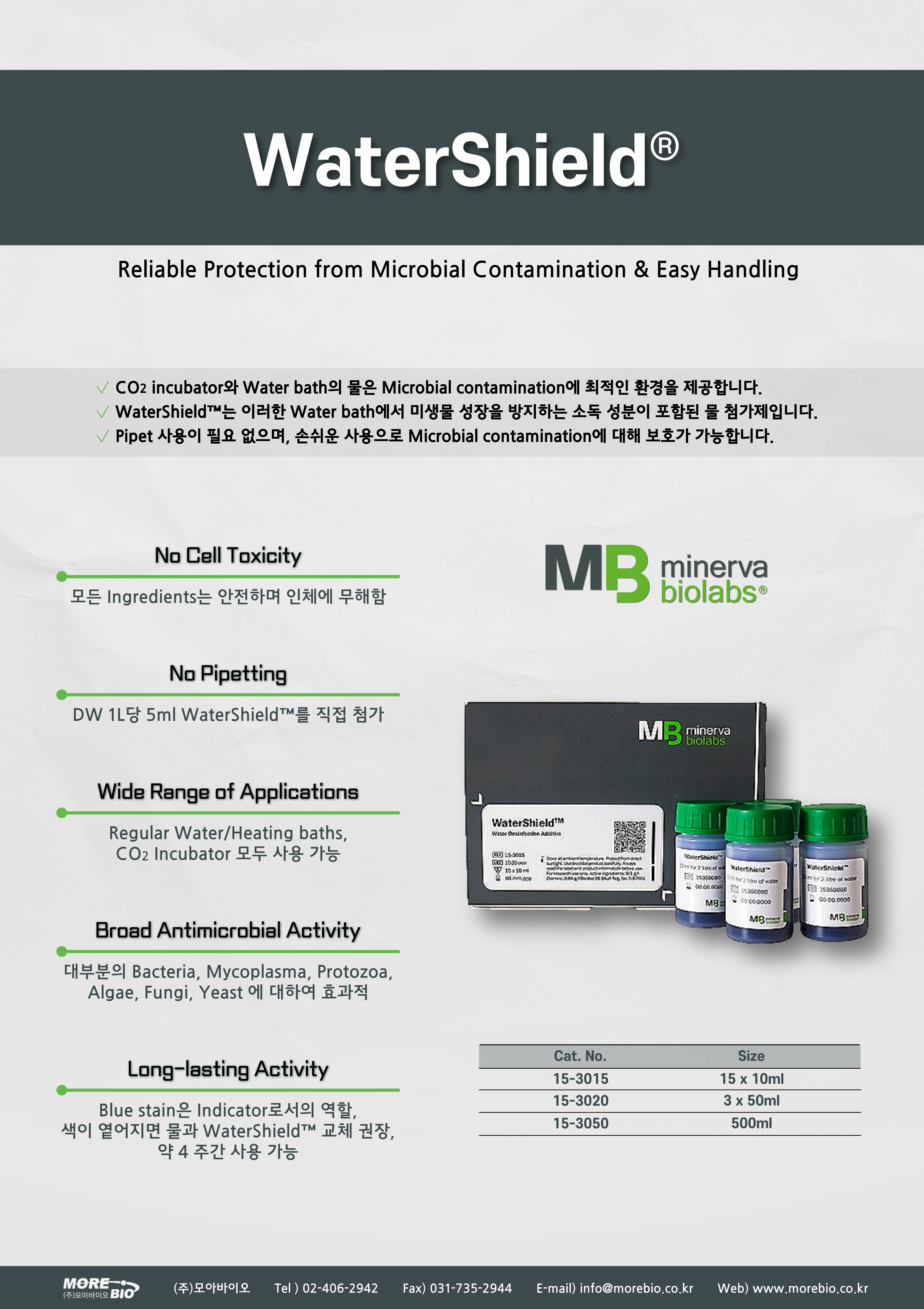 WaterShield™는 일반적인 워터배스 및 가열 배스, CO₂ 인큐베이터의 워터 팬 등에도 사용 가능하며, 일반적인 실험실 표면(예: 주석도금 철, 크롬, 니켈강, 고급 스테인리스강, 구리)과도 호환됩니다.