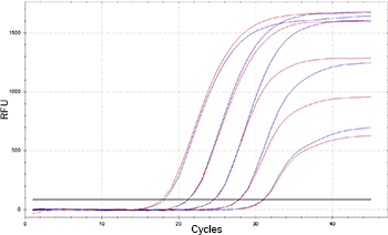Exemplary qPCR amplification plotMycoplasma are specifically detected by amplifying a highly conserved 16S rRNA coding region in the mycoplasma genome. PCR-based methods are highly sensitive compared to culture-based or staining methods. It is possible to detect mycoplasmas in cell cultures in a very early state of contamination and low concentrations. Compared to the culture or staining method, PCR analysis delivers accurate and highly sensitive results in a few hours. Mycoplasma can be detected via conventional PCR and subsequent gel electrophoresis, via real-time PCR or digital PCR. These easy, rapid, efficient and cost-effective methods deliver highly sensitive, specific and reliable results.